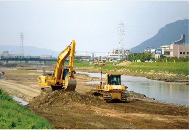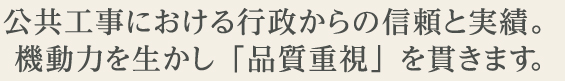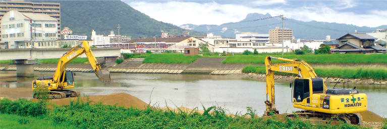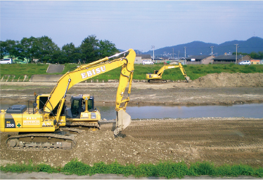 河川や港湾の護岸工事では、何十年と崩れない安全性が重要であり、 基本に忠実に正しく施工できる知識と経験が必要です。 私たちは、公共工事において行政から厚い信頼を頂き、 おかげさまで県内トップクラスの実績を積み重ねる事ができました。 これからも、多彩な重機を生かし機動力を使い、さらなる「品質重視」を貫きながら 県内外の豊かな生活環境整備に貢献し続けます。