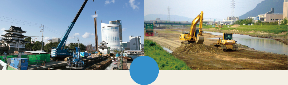 河川や港湾の護岸工事では、何十年と崩れない安全性が重要であり、 基本に忠実に正しく施工できる知識と経験が必要です。 私たちは、公共工事において行政から厚い信頼を頂き、 おかげさまで県内トップクラスの実績を積み重ねる事ができました。 これからも、多彩な重機を生かし機動力を使い、さらなる「品質重視」を貫きながら 県内外の豊かな生活環境整備に貢献し続けます。